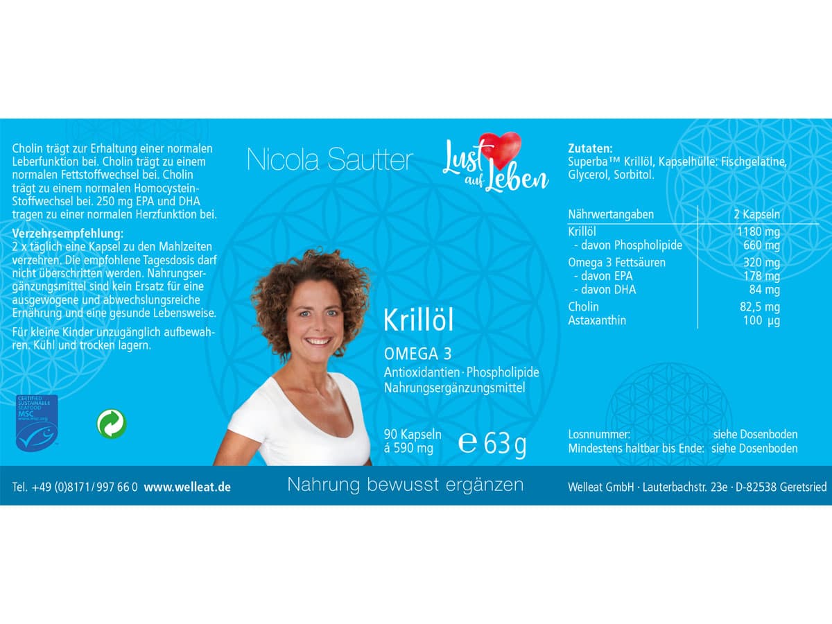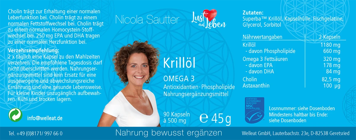 Anders als herkömmliches Fischöl ist Krillöl nicht an Triglyceride gebunden, sondern an Phospholipide. Ein Riesenvorteil, weil es Fette sind, die unser Gehirn und alle Zellmembranen auskleiden. Durch die Einnahme von Krillöl wird also alles bestens ernährt und gewährt einen reibungslosen Ablauf für unser Gehirn und alle Körperzellen. Mein Krillöl ist durch die molekulare Destillation frei von Rückständen und Schadstoffen. Zusätzlich enthält es auch wertvolles Cholin.