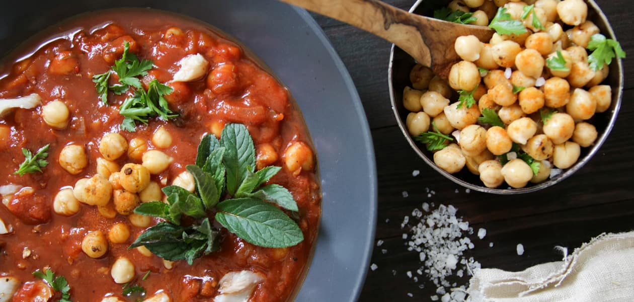 - Kichererbsen abspülen, zusammen mit dem Fisch zu der Tomatensuppe geben und ca. 5 Min. gar ziehen lassen.